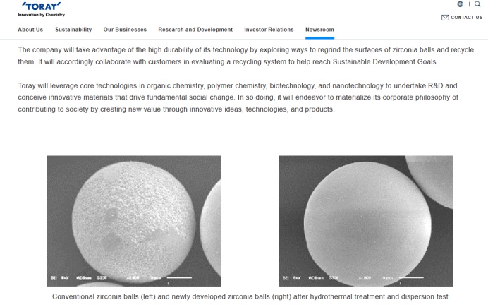 6、日本東麗宣布已經開發出世界上首個無稀土氧化鋯球的大規模生產技術