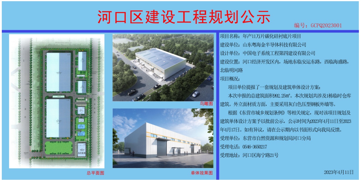 中國粉體網訊  近日,“河口自然資源和規劃”發布山東粵海金半導體科技有限公司年產11萬片碳化硅襯底片項目臨時建設工程規劃批前公示。