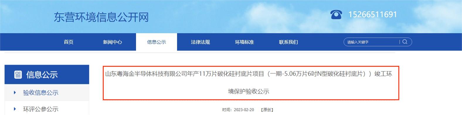 2月20日,東營環境信息公開網對外公示了山東粵海金半導體科技有限公司年產11萬片碳化硅襯底項目的竣工環境保護驗收。