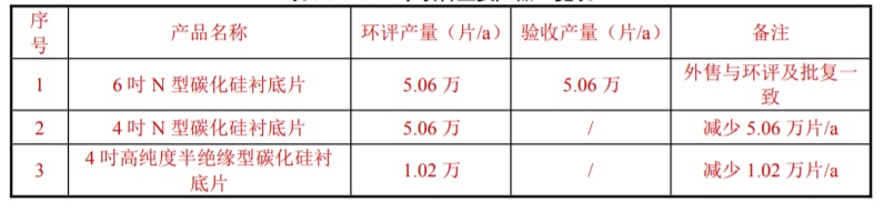 根據報告顯示,該項目總投資約6.5億元,由于市場變化,項目分為兩期建設。一期已建成1座碳化硅長晶(PVT法)及襯底片加工車間(104#),購置6英寸升華法長晶爐、端面研磨機等設備形成年產5.06萬片6吋N型碳化硅襯底片的生產規模。目前該項目一期已竣工。