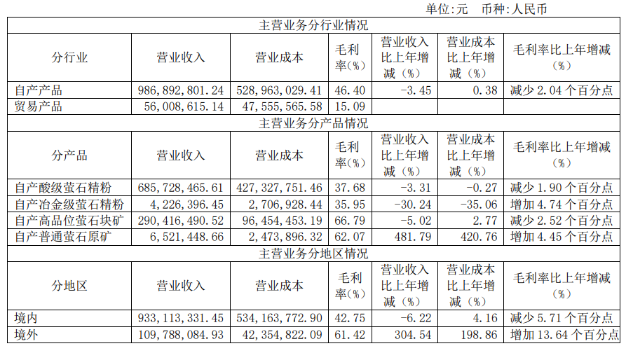 報告期內,公司共生產酸級螢石精粉和高品位螢石塊礦約41萬噸,較2021年全年的47萬噸產量減少約6萬噸;銷售酸級螢石精粉和高品位螢石塊礦約43萬噸(含貿易產品約2萬噸),同比減少約4萬噸。另外,包鋼金石全年生產螢石粉約11萬噸。