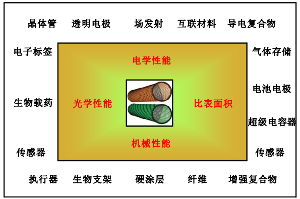 碳納米管具有可以自由進入細胞的極小尺寸,其獨特的結構,使其具備了超強的力學性能、極高的載流子遷移率、可調節的帶隙、優異的熱學性能、光電特性、穩定的化學特性等。碳納米管結構上的微小差異,會導致性質上的巨大不同,由于單壁碳納米管家族龐大,不同手性結構的單壁碳納米管能帶結構各異,為各種應用提供了多種選擇。碳納米管集各種優異性質于一身,使其在工程材料、電子器件、儲能領域、光探測器、生物醫藥等方面具備了廣闊前景,在以上應用領域具有很大優勢。