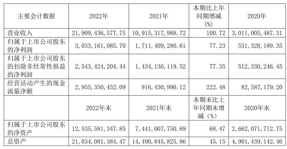 中國(guó)粉體網(wǎng)訊 近日,弘元綠能發(fā)布2022年年報(bào)和2023年一季報(bào),2022年,公司營(yíng)業(yè)收入219.09億元,同比增長(zhǎng)100.72%;歸屬于上市公司股東的凈利潤(rùn)30.33億元,同比增長(zhǎng)77.23%。對(duì)于公司營(yíng)業(yè)收入增長(zhǎng)的原因,弘元綠能表示是公司單晶硅業(yè)務(wù)規(guī)模擴(kuò)大所致。