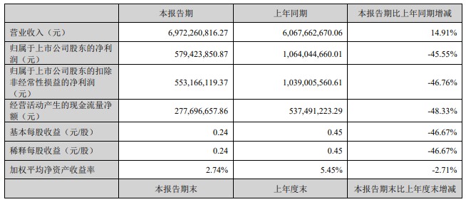 2023年,第一季度實(shí)現(xiàn)營(yíng)業(yè)收入69.72億元,同比增長(zhǎng)14.91%;歸屬于上市公司股東的凈利潤(rùn)5.79億元,同比下降45.55%。