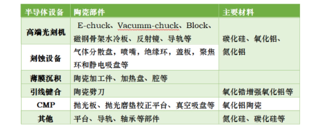 關鍵零部件在半導體設備中具有舉足輕重的作用,要求結構件材料具有高純度、高致密度、高強度、高彈性模量、高導熱系數及低熱膨脹系數等特點,且結構件要具有極高的尺寸精度和結構復雜性。在2022年由中國粉體網主辦的“第一屆半導體行業用陶瓷材料技術研討會”期間,據中國建筑材料科學研究總院的劉海林所長介紹,碳化硅陶瓷在半導體制造的前段到后段工藝裝備中都有廣泛應用,例如在研磨拋光吸盤、光刻吸盤、檢測吸盤、精密運動平臺、刻蝕環節的高純碳化硅部件、封裝檢測環節中精密運動系統等等。