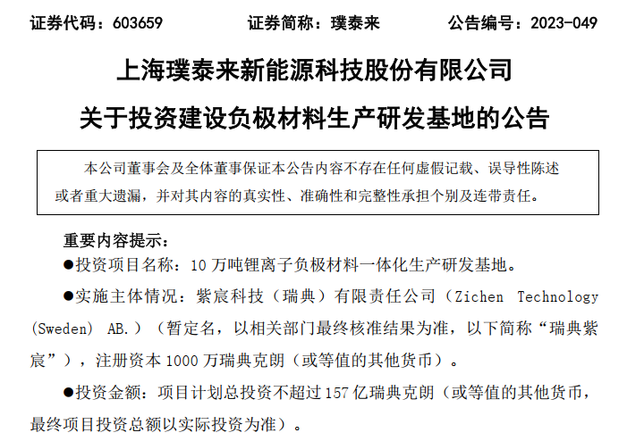 中國粉體網訊 5月4日晚間,璞泰來發布公告,擬通過全資子公司璞泰來(新加坡)有限責任公司在瑞典投資設立紫宸科技(瑞典)有限責任公司(以下簡稱“瑞典紫宸”),開展瑞典10萬噸鋰離子負極材料一體化生產研發基地的建設工作,注冊資本1000萬瑞典克朗(或等值的其他貨幣)。