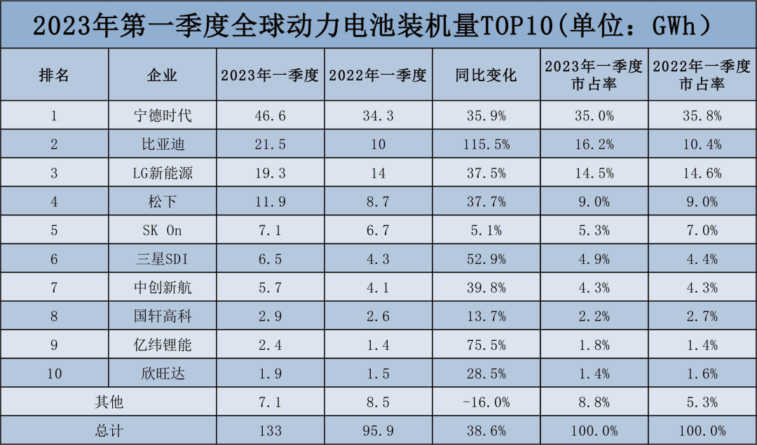 中國粉體網(wǎng)訊 據(jù)SNE Research最新數(shù)據(jù),2023年一季度全球動力電池裝機量為133GWh,同比增長38.6%。裝機量排在前十的企業(yè)分別是:寧德時代、比亞迪、LG新能源、松下、SK On、三星SDI、中創(chuàng)新航、國軒高科、億緯鋰能、欣旺達。
