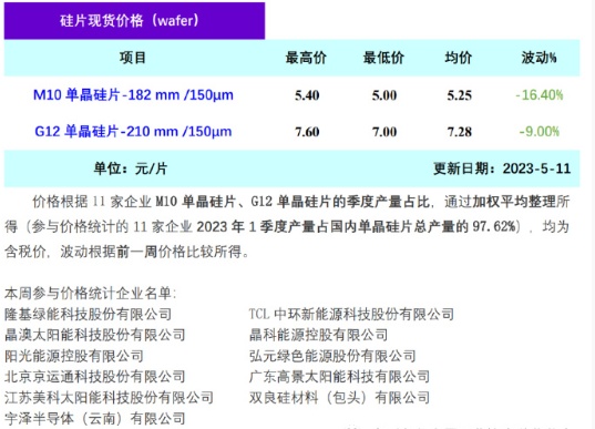 據(jù)粉體網(wǎng)了解,中國(guó)有色金屬工業(yè)協(xié)會(huì)硅業(yè)分會(huì)最新發(fā)文稱(chēng),本周硅片價(jià)格大幅下跌。M10單晶硅片(182 mm /150μm)價(jià)格區(qū)間在5.0-5.4元/片,成交均價(jià)降至5.25元/片,周環(huán)比降幅為16.4%;G12單晶硅片(210 mm/150μm)價(jià)格區(qū)間在7.0-7.6元/片,成交均價(jià)降至7.28元/片,周環(huán)比降幅為9%。本周市場(chǎng)成交價(jià)格混亂,成交量普遍偏小。價(jià)格大幅下跌主要由于兩方面原因,其一是本周價(jià)格降幅橫跨兩周,因此跌幅略顯夸張,但實(shí)則經(jīng)歷了兩輪階段性調(diào)價(jià);其二是傳導(dǎo)原材料降價(jià)空間,并持續(xù)向下游釋放利潤(rùn)。