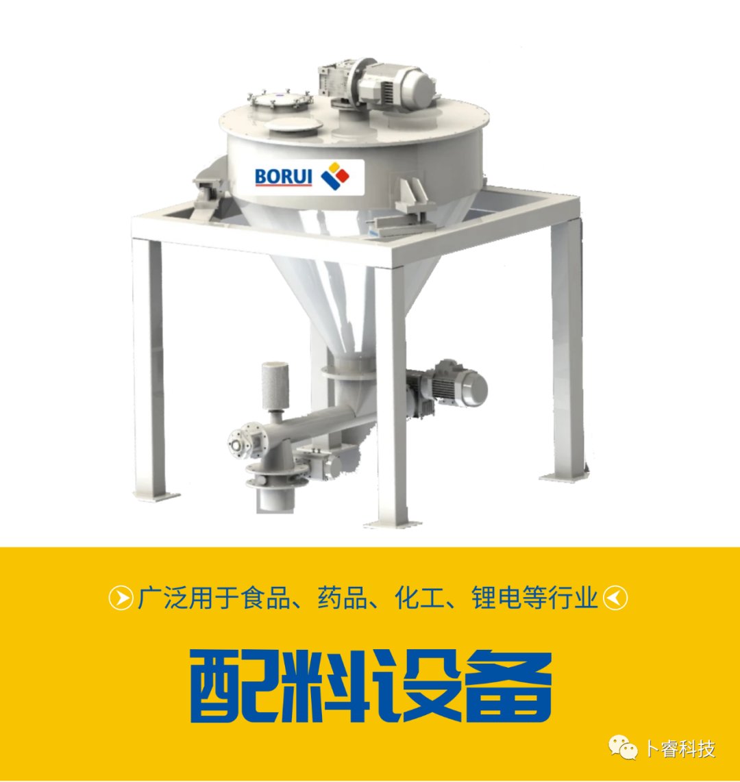 配料設(shè)備:主要由投料站、真空輸送機(jī)、緩存?zhèn)}、失重稱、高速混合機(jī)等構(gòu)成,適用于多種粉料的從拆包裝到混合的生產(chǎn)過程,廣泛用于食品、藥品、化工、鋰電等行業(yè)。