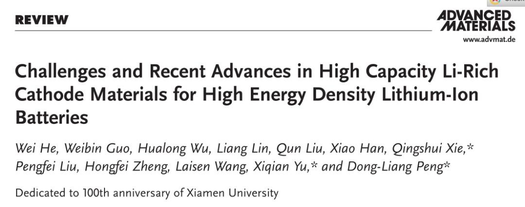 Challenges and Recent Advances in High Capacity Li-Rich Cathode Materials for High Energy Density Lithium-Ion BatteriesWei He, Weibin Guo, Hualong Wu, Liang Lin, Qun Liu, Xiao Han, Qingshui Xie,* Pengfei Liu, Hongfei Zheng, Laisen Wang, Xiqian Yu,* and Dong-Liang Peng* Adv. Mater., 2021, DOI: 10.1002/adma.202005937