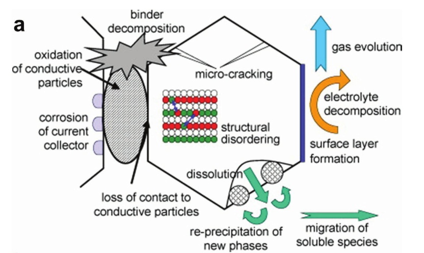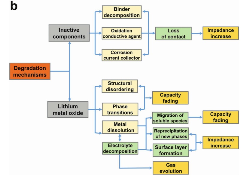 圖4.a)鋰離子正極材料基本老化機制綜述;b)鋰電正極材料各種降解機制之間的邏輯關系示意圖。