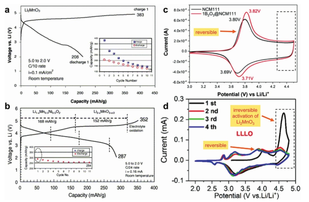 圖5.a)Li/Li2MnO3電池的電化學充放電曲線;b) Li/0.3Li2MnO3∙0.7LiMn0.5Ni0.5O2電池的初始充放電特性;c)三元NCM111和1B2O3@ NCM111陰極的初始循環(huán)伏安曲線;d) 富鋰正極材料的CV圖。