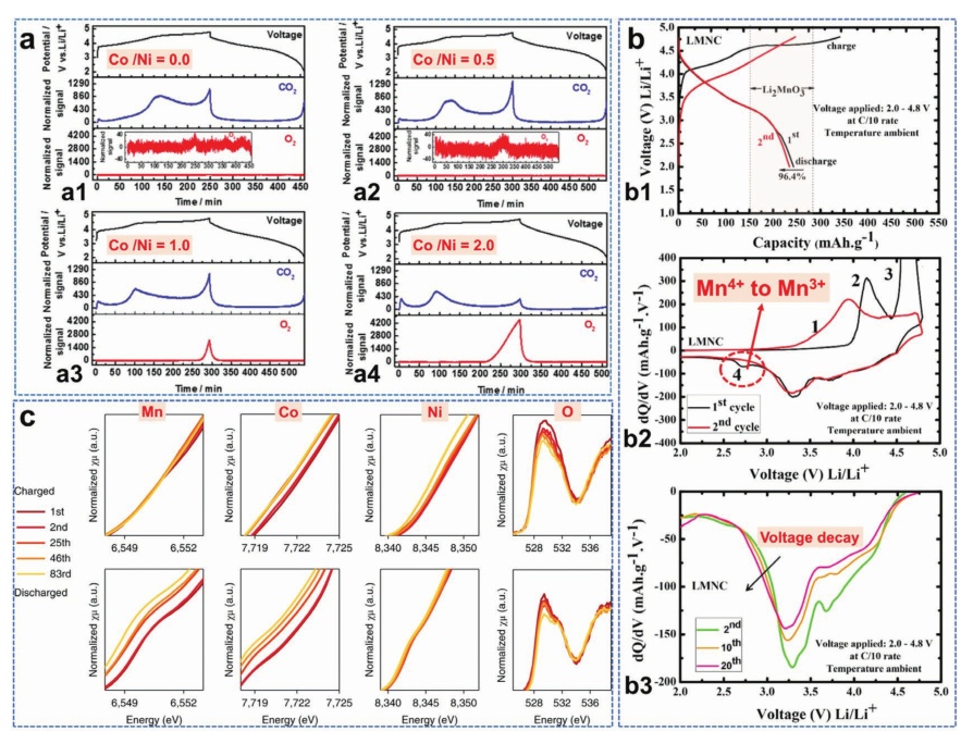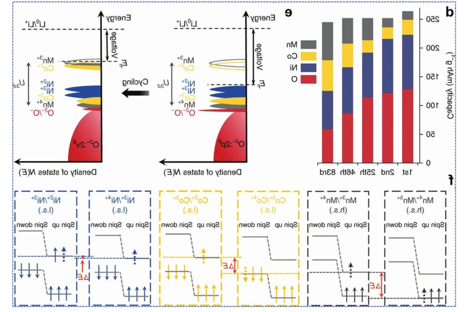圖7.a)富鋰正極的CO2(m/z= 44)和O2(m/z=32)演變圖;b)制備的原始LRM的前兩條充放電曲線和相應的dQ/dV曲線;c)Li1.2Ni0.15Co0.1Mn0.55O2中不同元素在不同循環(huán)下的XAS結果;d)在不同循環(huán)中,每個元素對放電容量的貢獻;e)費米能級的圖解;f)不同氧化還原偶的圖表。