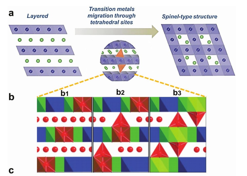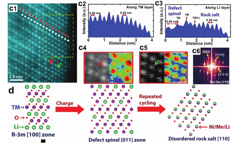 圖8.a)層狀向尖晶石型相變示意圖;b)Li-Li對稱示意圖;c)富鋰材料經(jīng)過十次循環(huán)后的晶體結構;c1)高分辨率STEM圖像;c2)峰強圖;c3)沿著白色虛線(Li層)繪制強度圖,如(c1)所示;c4)放大的STEM圖像顯示了缺陷尖晶石結構(LT-LiCoO2型結構),空洞的16c八面體位置;c5)放大的STEM圖像顯示了結構的八面體位置(無序的巖鹽結構);c6)從(c1)中黃色虛線矩形表示的區(qū)域進行快速傅里葉變換(FFT);d)解釋結構演化路徑的原子模型。