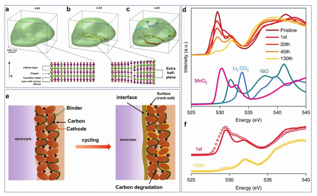 圖9.a - c)充電過程中位錯網(wǎng)絡的形成;d)不同周期樣品的PEY O K-edge的XAS;e)帶電(圓符號)和放電(線)樣品PEY中的O k-edge的XAS;f) Li1.2Ni0.15Co0.1Mn0.55O2活性材料的界面形成和表面重建。