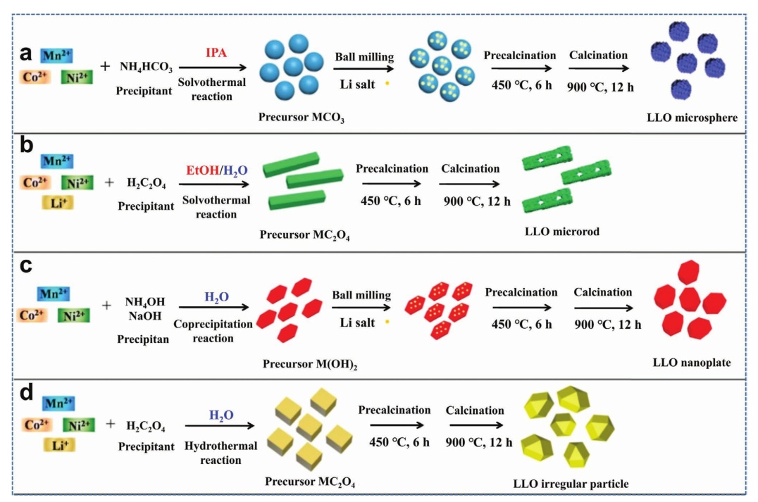 圖10.富鋰正極材料的微球a)、微棒b)、納米板c)和不規(guī)則粒子d)的形成過程示意圖。