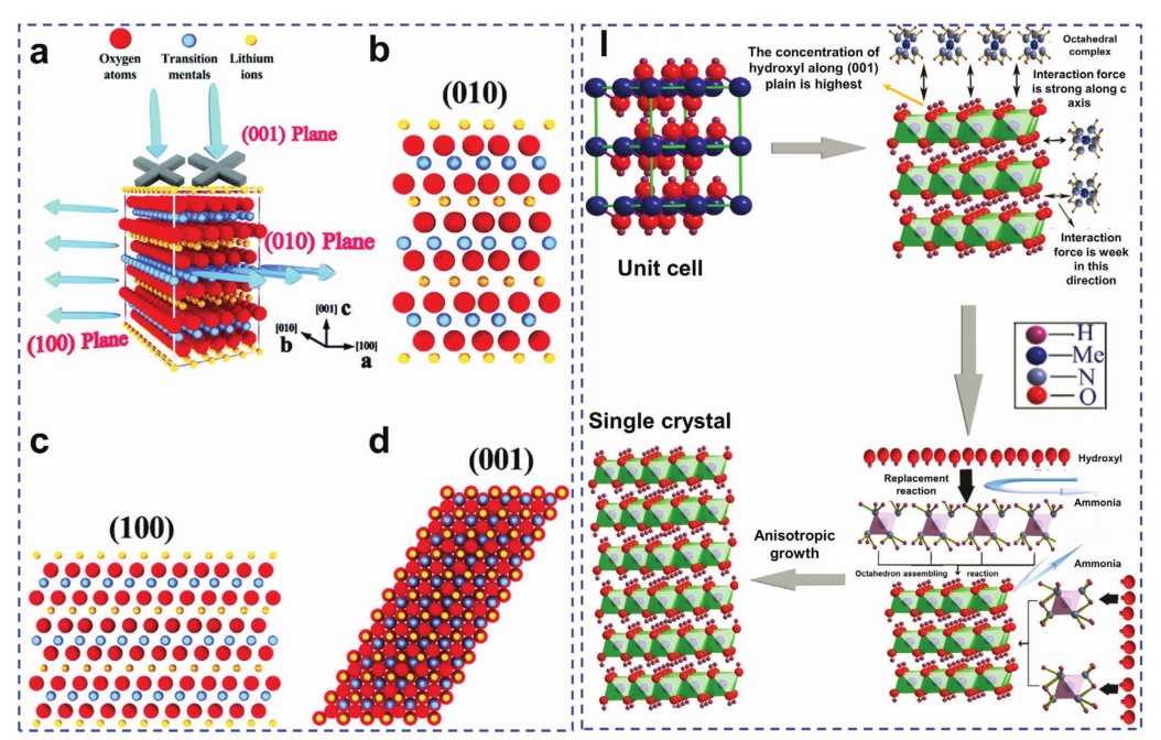圖11. a)層狀鋰金屬氧化物正極的晶體結構,b)(010)平面,c)(100)平面,d)(001)平面;e-i) 富鋰基碳酸鹽前驅(qū)體的SEM圖像;j)不同的鋰在三維立方體正極和k)常見的0D類微球正極中的擴散動力學;l) Ni1/3Co1/3Mn1/3(OH)2晶體的各向異性生長過程。