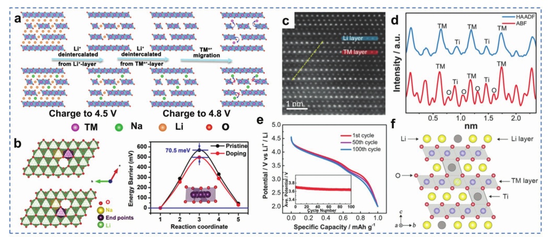 圖14.a) Na和F共摻雜富鋰正極材料在去除鋰離子過程中的結構示意圖;b) La和Ti分別摻雜到表面、富鎳第一層、富鎳第二層和富鎳第三層,其遷移能差如(c)所示。