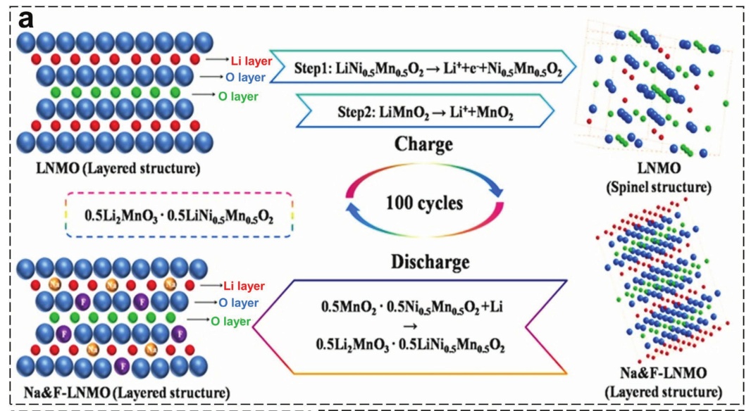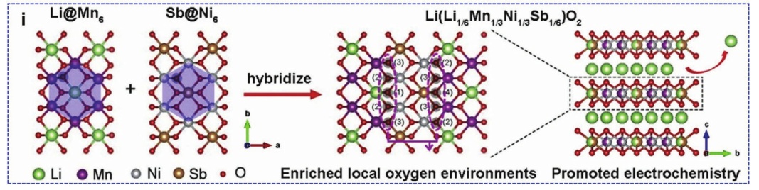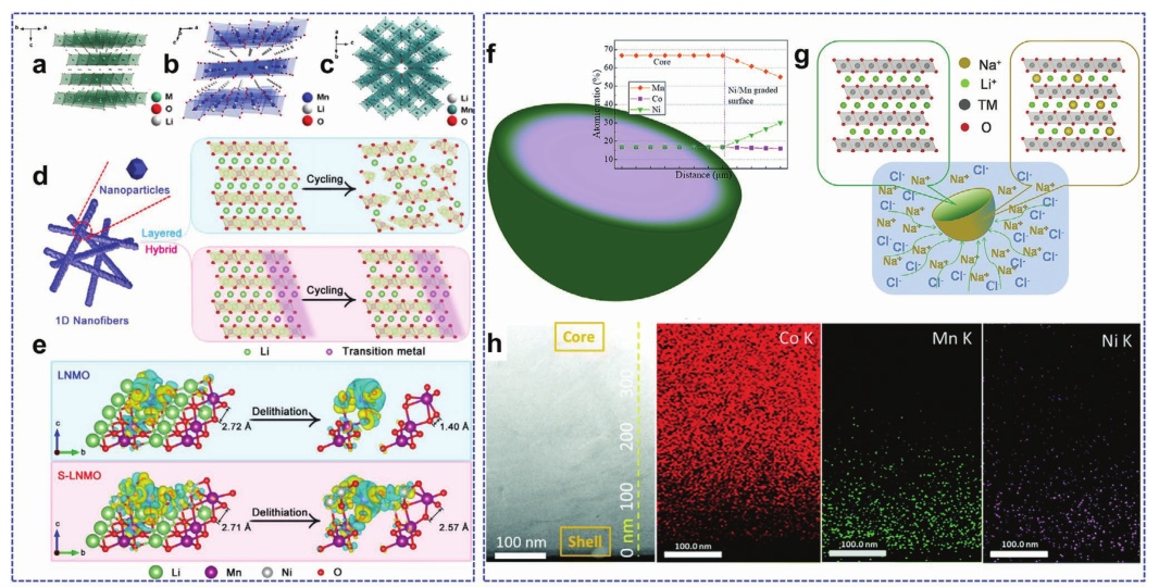 圖17.a)層狀LiTMO2晶體結構示意圖;b)單斜Li2MnO3、c) Li4Mn5O12尖晶石相;d)一維異質(zhì)尖晶石/層狀富鋰正極的結構優(yōu)點示意圖;e) DFT計算Li2MnO3與尖晶石包覆Li2MnO3脫色前后的電荷密度差;f) Ni/Mn梯度的富鋰材料示意圖;g)表面梯度Na+摻雜富鋰正極材料示意圖;h)制備FIB后G-LCO粒子的STEM圖像和Co、Mn、Ni元素的EDS映射;i) 富鋰正極合成示意圖。