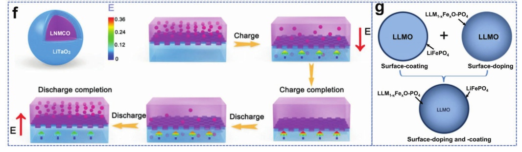 圖15.a)原始LRM(上)和LSM涂層(下)的結構演化示意圖;b-e) LLLO的設計;f) LiTaO3-LRM材料的LiTaO3改性層的動態(tài)和壓電方案;g) LiFePO4表面涂層和表面摻雜層狀富鋰氧化物示意圖。