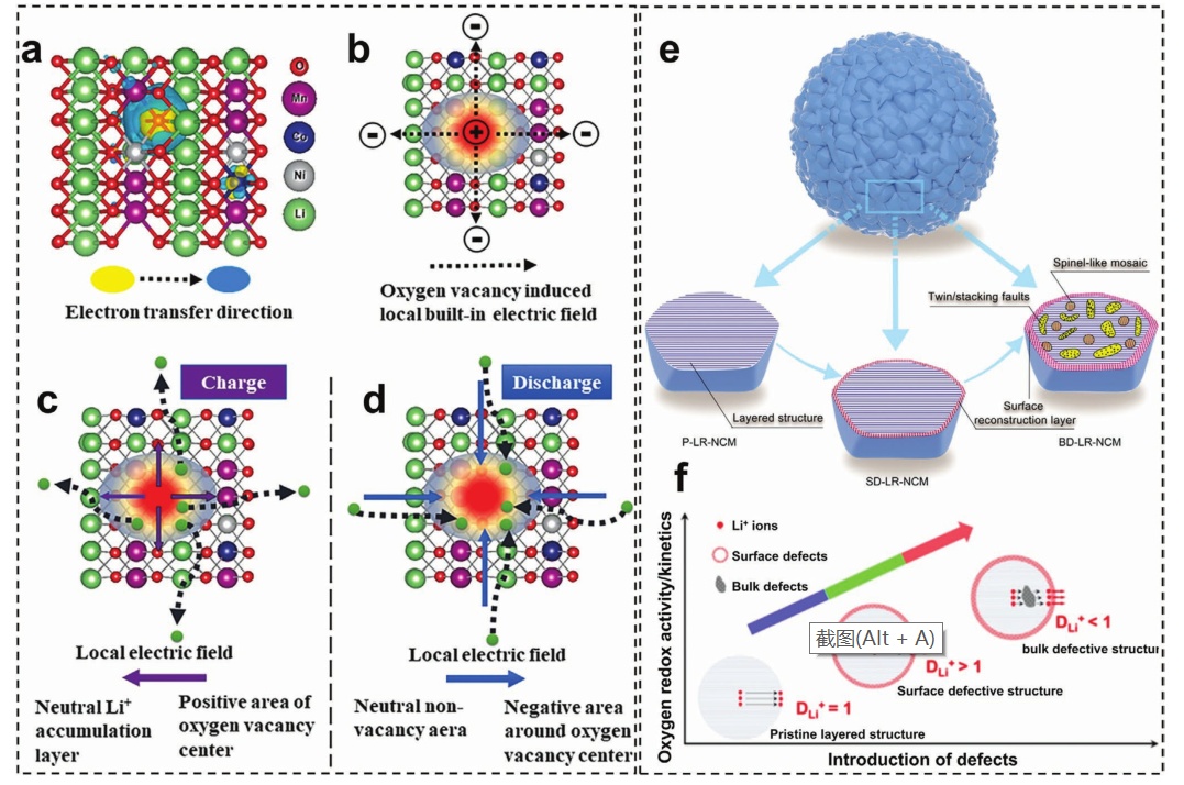 圖16.a-d)基于DFT計算的氧空位示意圖;e)原始和缺陷樣品的原始顆粒微觀結構示意圖;f) 富鋰氧化物正極缺陷、Li+離子擴散與氧氧化還原活性/動力學關系示意圖。