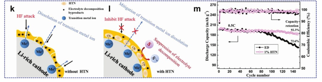 圖18.a)氟化聚酰亞胺(FPI)球棍型和b)聚偏氟乙烯(PVDF)粘合劑;c) PVDF-LRM//石墨(左)和FPI-LRM//石墨全電池(右)的充放電電壓分布,以及它們的d)循環(huán)性能;PVDF-LRM正極e)和f)100次循環(huán)前后的粒子形態(tài),F(xiàn)PI-LRM正極;h)和i)100次循環(huán)前后的粒子形態(tài),g, j)分別為其粒子形態(tài)和表面狀態(tài)變化示意圖;k)原始富鋰正極和l)1,3,6-己二腈(HTN)添加劑在正極電解質(zhì)上的表面改性機理的示意圖;m)在ED和含HTN的電解液中循環(huán)LRM/Li細胞的循環(huán)性能。