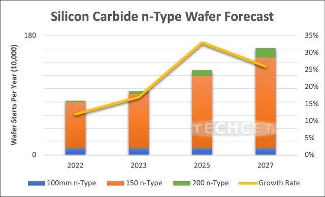 根據該機構數據,2022年,碳化硅N型襯底市場比2021年增長了約15%,出貨量達到總計88.4萬片(等效6英寸),預計該市場將在2023年進一步增長,達到107.2萬片晶圓(等效6英寸),比2022年進一步增長約22%,2022-2027年的整體復合年增長率估計約17%。