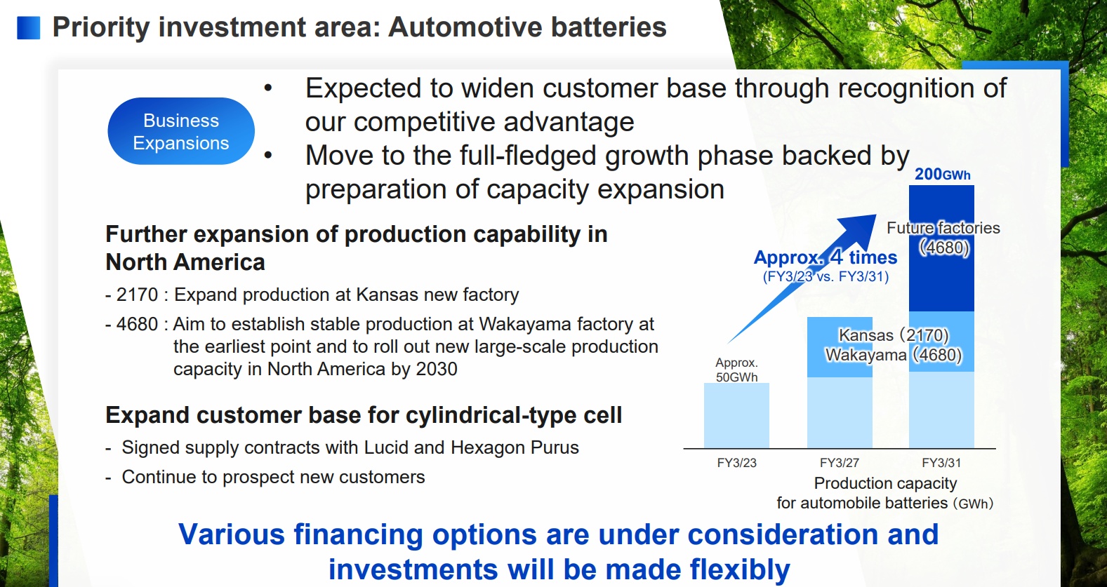 當然,松下在這方面也并沒有令市場失望。在官方發布的規劃綱要中,公司明確表示,將在2031年3月底前,將電動車電池的產能擴大至200吉瓦時/年,大概是今年3月底的4倍。公司發言人也確認,在4680電池產能方面,除了盡快推進和歌山工廠的穩定量產外,還將在2030年前在北美至少新建2座工廠生產4680電池。