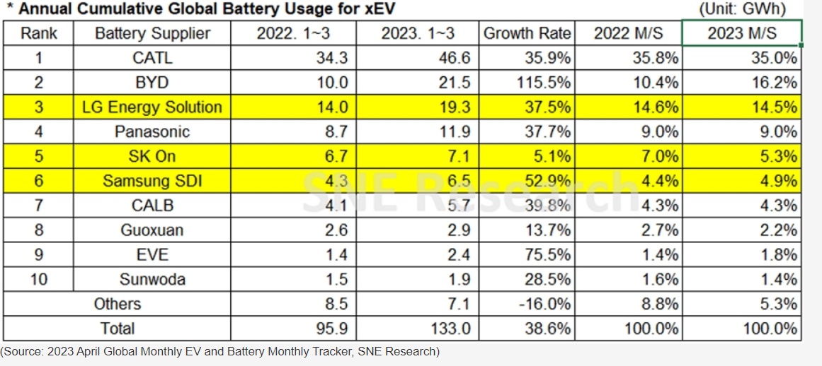 這個目標大概是什么概念呢?這里粗略地用韓國電池研究機構SNE Research的數據進行對比。2022年全球電動車電池的裝車總量達到518吉瓦時,其中絕對的龍頭寧德時代達到191.6吉瓦時。而在今年前三個月,異軍突起的比亞迪也上升到全球第二,一季度寧德時代和比亞迪的裝車總量分別為46.6吉瓦時和21.5吉瓦時。