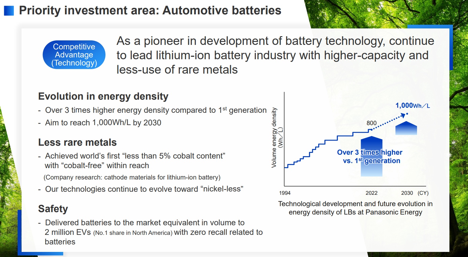 在電池技術方面,松下也提出了面向2030年的目標:除了將電池的能量密度從目前的800瓦時/升提升到1000瓦時/升外,還要爭取實現“鈷含量低于5%”、“少鎳”、甚至沖擊“無鈷”的目標。同時在實現電池產能滿足每年200萬輛電動車的基礎上,避免因電池引發召回事件。