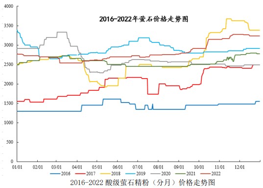 螢石行業在下游階段性開工提升之下,逆流而上,報價逐步攀高,至2022年末甚至達到了3275元/噸,為近兩年以來的高點。
