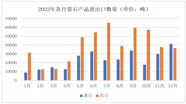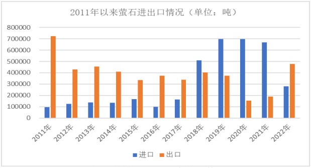 2022年,供應端由于國內環保力度加大,螢石選廠開工水平始終處于低位,加之墨西哥的螢石生產商庫拉(Koura)的礦山出現安全問題和北美主要的螢石生產商加拿大螢石公司(CanadaFluorsparInc.)因成本倒掛進入破產程序等外部因素,我國螢石出口量大幅增長,這在一定程度上加深了國內螢石供應偏緊的現狀。需求端由于下游氟化工行業新能源、新材料領域的新增產能陸續釋放,螢石需求持續放量,供需趨緊使得國內螢石市場呈現震蕩走高態勢。