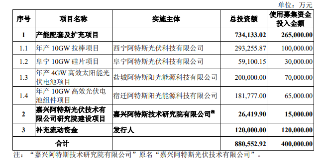 值得關注的是,阿特斯本次發行募集資金扣除發行費用后,將投資于以下項目: