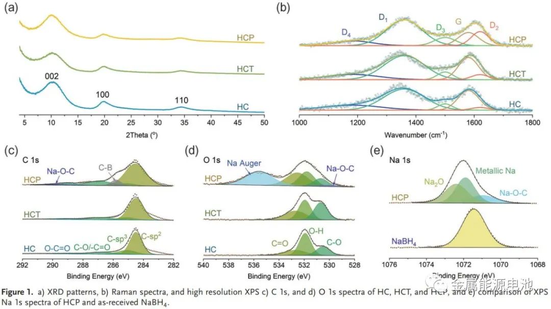 1、本研究探討了兩種改善ICE的策略:在1000°C下額外熱解和NaBH4熱分解預(yù)沉淀。對(duì)硬碳進(jìn)行熱處理可以有效地提高石墨化率和Csp2:Csp3比。