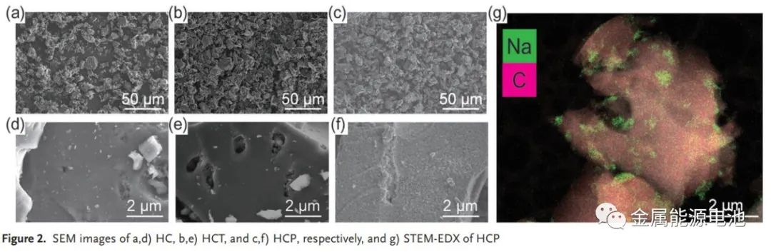 硬炭制備:為了研究熱解效果,將HC在1000℃下熱處理2h,形成HCT。用研缽和杵將NaBH4和HC按比例混合合成HCP。然后在密封石英安瓿中真空650℃熱處理3h。根據(jù)初始循環(huán)的容量損失計(jì)算HC中加入NaBH4的量。