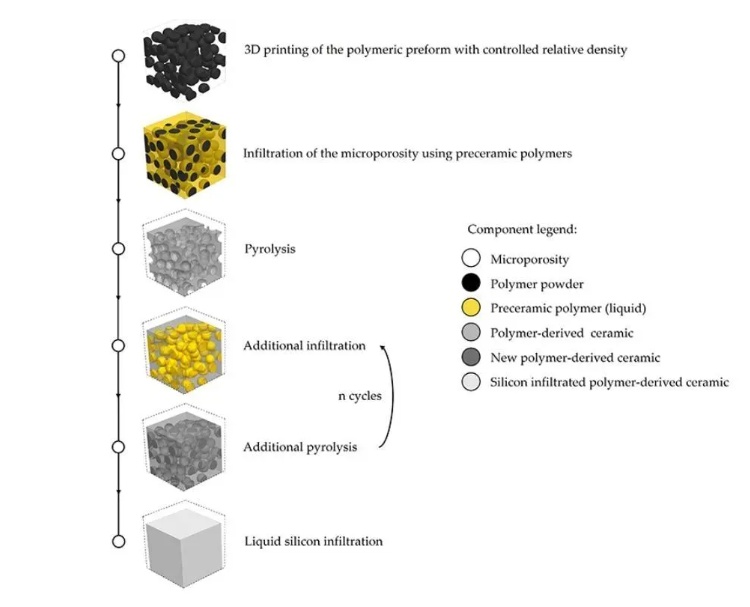 ● 該方法主要是通過(guò) SLS 3D 打印技術(shù)制造具有高微孔率的聚合物預(yù)制件,并結(jié)合陶瓷前聚合物的滲透。