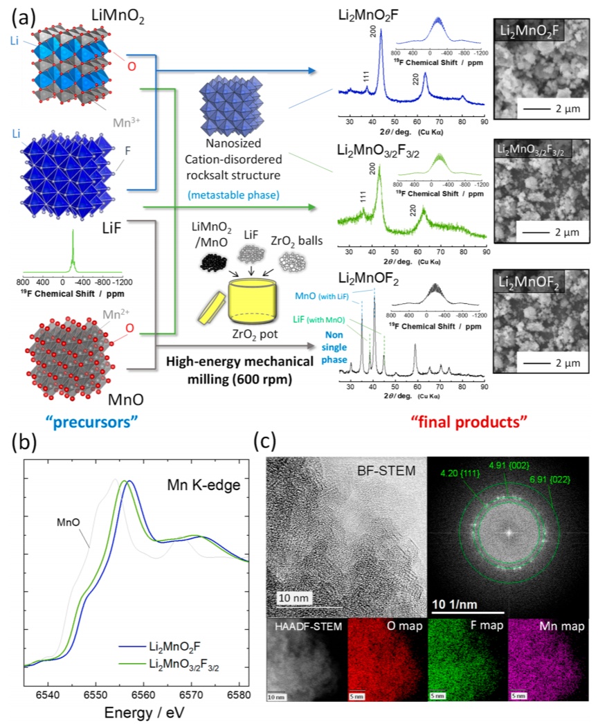 【圖1】(a)合成不同氟含量的過量鋰氧氟化錳的方案。b)Li2MnO2F和Li2MnO1.5F1.5的Mn K邊XAS光譜。(c)Li2MnO1.5F1.5的STEM / EDX研究結果。