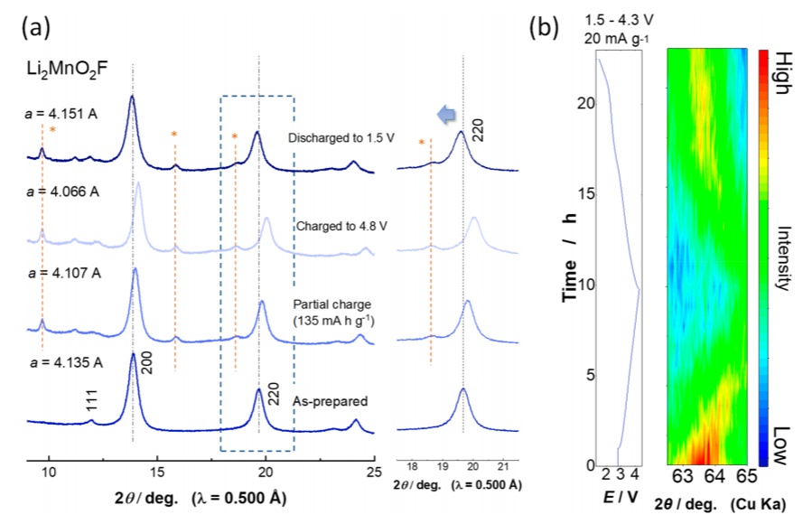 【圖4】利用(a)外部同步輻射X射線衍射和(b)原位X射線衍射研究Li2-yMnO2F的結構變化。在原位XRD數據上顯示了2 0衍射線的輪廓圖,該數據在20 mA g-1的速率下進行,具有4.3 V截止。充電后出現了用星號標記的未知峰,但由于在電化學循環中沒有峰移,該相似乎是電化學不活躍的。
