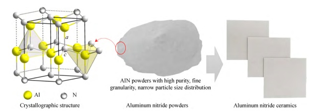 AlN 晶胞結(jié)構(gòu)、粉末及陶瓷基板(來源:何端鵬等,《高熱導(dǎo)電絕緣氮化鋁陶瓷在宇航器件中的應(yīng)用:概述、挑戰(zhàn)和展望》)