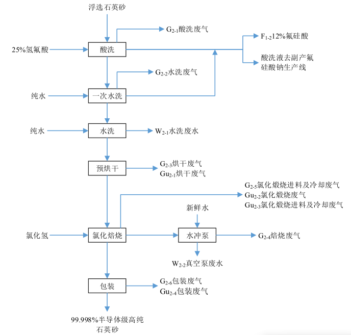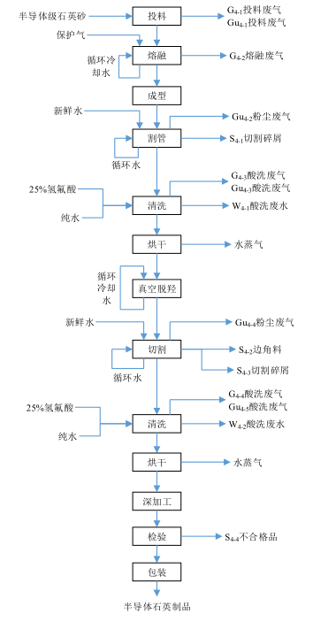 酸洗、純水沖洗、烘干:把加工成型的石英管及器件放入盛有12%的氫氟酸(25%氫氟酸+水)酸洗槽中酸洗,酸洗槽中酸液循環(huán)使用,定期補(bǔ)充,無廢酸液產(chǎn)生。該工序有氟化氫廢氣產(chǎn)生。酸洗過后的產(chǎn)品,表面附著少量酸液,放入清洗槽用高純水清洗,去除表面附著的酸液,此工序產(chǎn)生含氟廢水。清洗過后的產(chǎn)品,經(jīng)廠區(qū)烘干系統(tǒng)烘干,烘干系統(tǒng)采用電加熱,去除產(chǎn)品表面的殘留水分,在烘干過程中會產(chǎn)生少量水蒸氣。