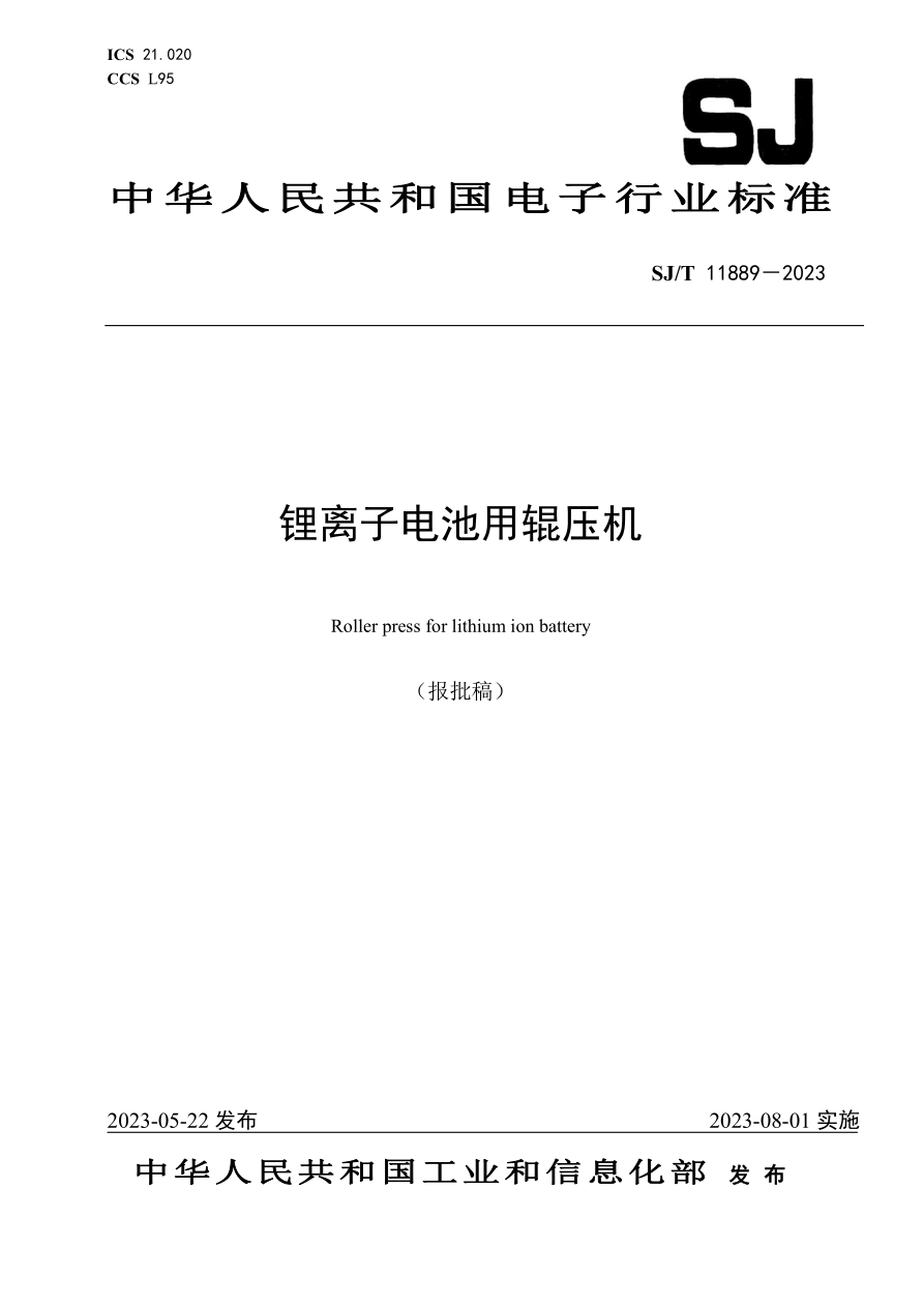 SJ/T11889-2023《鋰離子電池用輥壓機》適用于軋制鋰離子電池極片用的輥壓機,規定了鋰離子電池用輥壓機的術語和定義、型號、技術要求、檢驗方法、檢驗規則、標志、包裝、運輸和貯存。