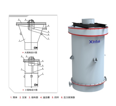 第二種設備是受阻沉降器,其在硅砂行業應用比較廣泛,應用到分級和脫泥作業中。鑫海的受阻沉降器采用了幾個比較新穎的結構。第一是底下水嘴采用高彈性橡膠和特殊的開口設計,在給入壓力水進行干涉沉降的時候,水嘴能夠自動打開,停車的時候能夠自動鎖閉,這樣不易堵塞,能夠保證生產流程的暢通。另外,此設備采用干涉沉降,干涉沉降比自然沉降的分級效率大大提高。在干涉成降的時候,干涉水流能夠使細顆粒從上面流出去,粗顆粒從底下排出來,從而使分級的粗物料、細物料及泥能夠最大限度的分開。