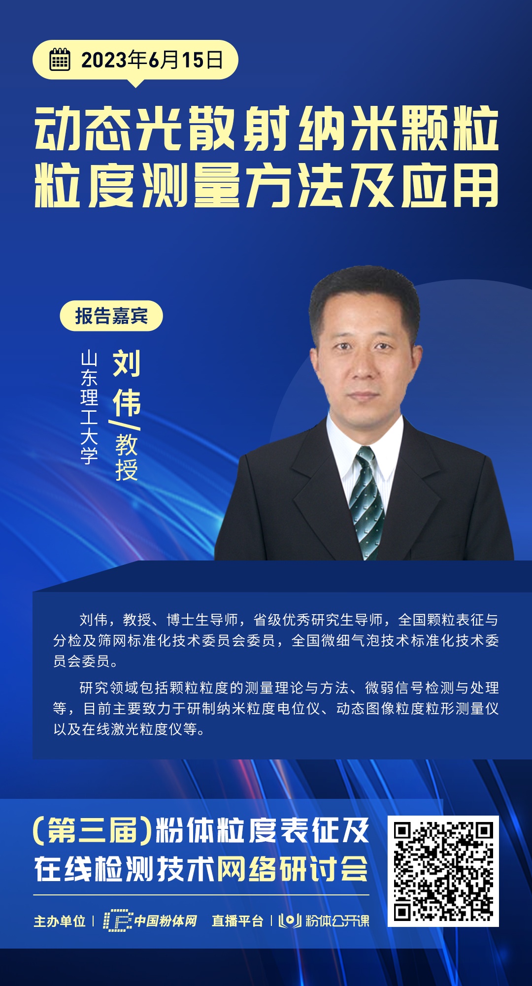 此次直播特邀山東理工大學(xué)劉偉教授做報(bào)告:動(dòng)態(tài)光散射納米顆粒粒度測(cè)量方法及應(yīng)用