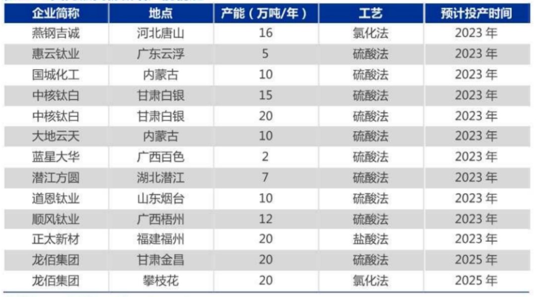 2023~2025年國內(nèi)鈦白粉產(chǎn)能規(guī)劃