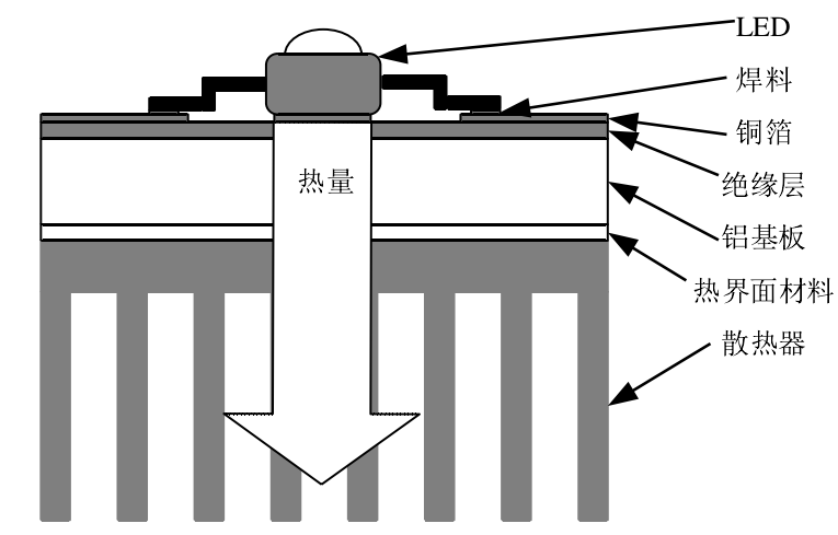 鋁基覆銅板在LED功率器件中的散熱過程示意圖