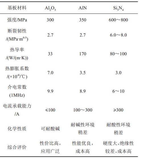 AlN陶瓷熱膨脹系數與Si器件匹配度高,且熱導率高于Al2O3陶瓷,隨著AlN陶瓷工藝技術的日益成熟,在熱導率要求高的功率器件中逐漸替代Al2O3和BeO陶瓷是一大趨勢;Si3N4陶瓷熱導率適中、熱膨脹系數小、耐磨損、機械強度高,在大功率、高可靠的電力電子器件中具有廣闊的應用前景。