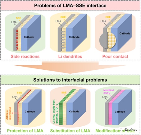基于硫化物固體電解質(SSEs)的全固態鋰電池(ASSLBs)可以克服當前鋰離子電池能量密度低和安全性問題,是最具前景的下一代能量存儲與轉化器件。然而,這類電池的實際應用受限于諸多問題,其中鋰金屬負極(LMA)與SSEs之間的界面問題尤為突出。近日,上海交通大學莊小東團隊和鄭州大學付永柱團隊在EcoMat上發表了題為“Li Metal Anode Interface in Sulfide-BasedAll-Solid-State Li Batteries”的綜述論文。首先總結了SSEs與LMA之間存在的界面問題,包括不良界面副反應、鋰枝晶生長、不良界面接觸;進一步講述了針對上述問題的解決方案,包括LMA的界面保護、LMA的取代負極、SSE的修飾改性;隨后介紹了針對界面演化的形貌及組成結構表征方法;最后從多個角度展望了LMA和SSE的界面工程策略。