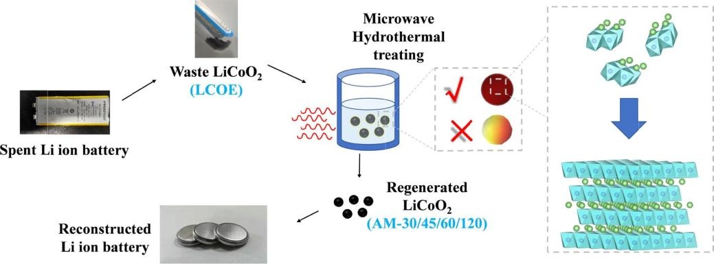 退役LCO電池修復制造鋰離子電池的過程(來源:LIU Yang,et al,《Microwave hydrothermal renovating and reassembling spent lithium cobalt oxide for lithium-ion battery》)