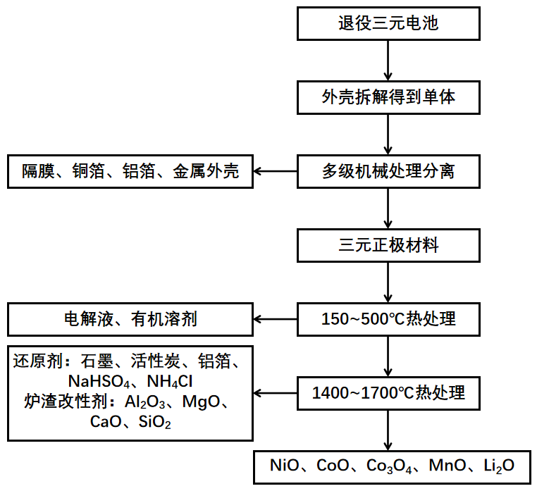 高溫固相法是將經(jīng)過簡單預處理的廢舊正極材料粉末與鋰源按一定的摩爾比混合。在一定溫度(600~950℃)下對混合物進行燒結(jié),制備再生鋰電池正極材料。
