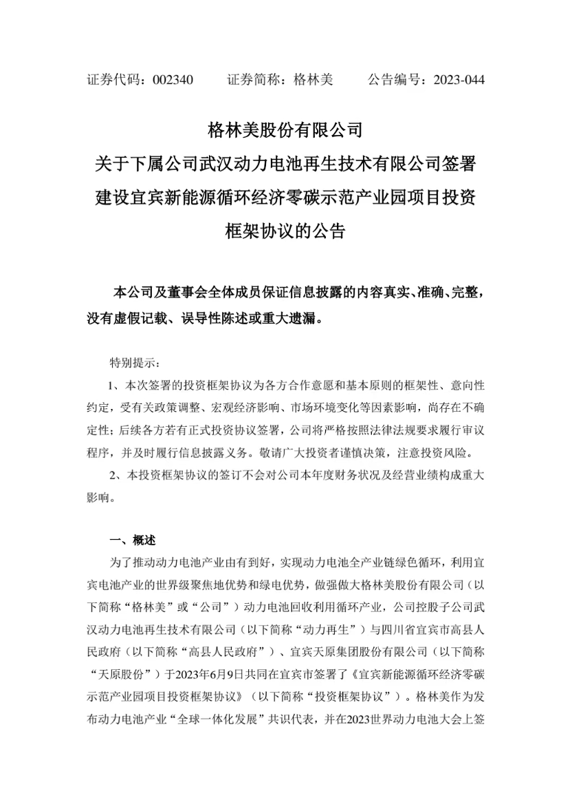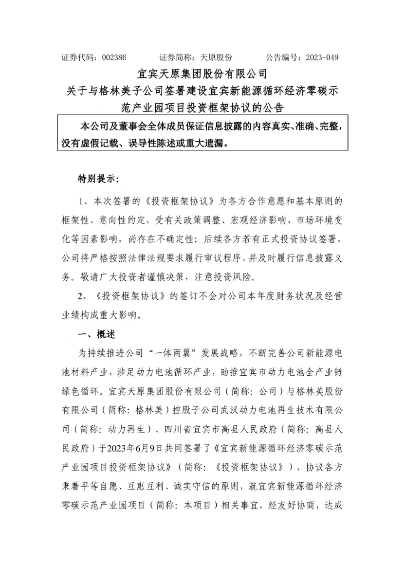 根據(jù)公告,當天公司控股子公司武漢動力電池再生技術有限公司與四川省宜賓市高縣人民政府、宜賓天原集團股份有限公司共同在宜賓市簽署了《宜賓新能源循環(huán)經(jīng)濟零碳示范產(chǎn)業(yè)園項目投資框架協(xié)議》。